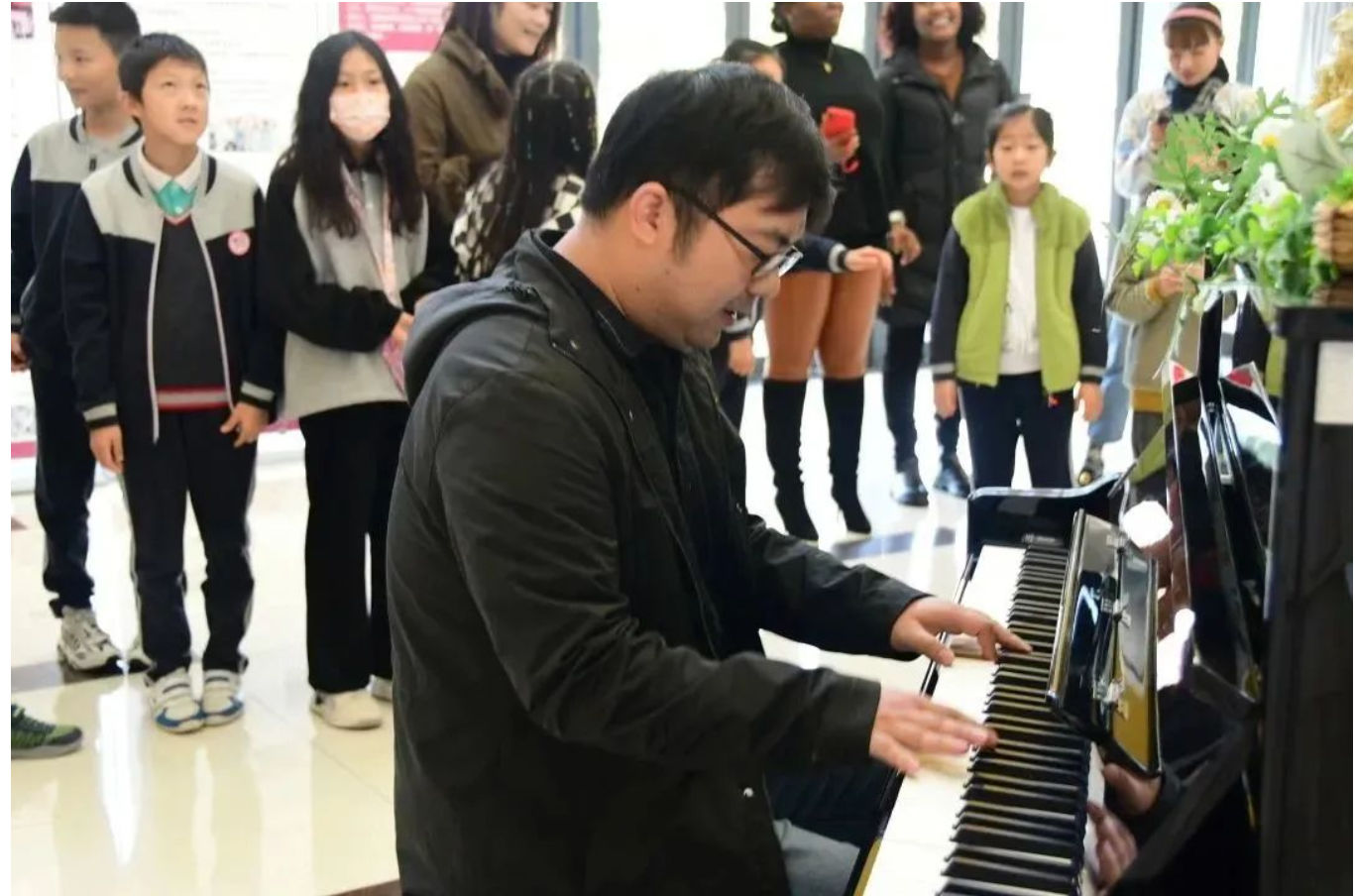 曹君凯老师给大家带来了惊喜的演奏,随着《孤勇者》的琴声响起,所有孩子们不约而同地齐声跟唱,清澈响亮的童声回荡在大厅中央。