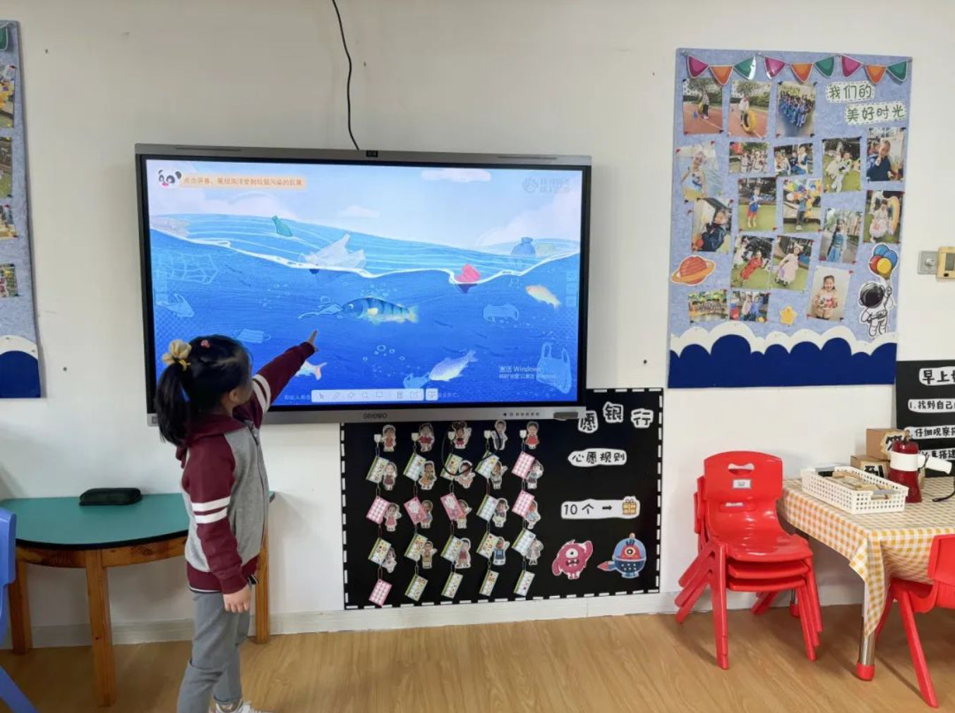 老师们向孩子科普全球气候变暖的背景,剖析造成这个现象的原因,就“怎样改善这个现象”展开了热烈的讨论。师生达成了一致的意见:做一些力所能及的举措,如可回收物、绿植、风力发电太阳能发电等缓解全球气候变暖。