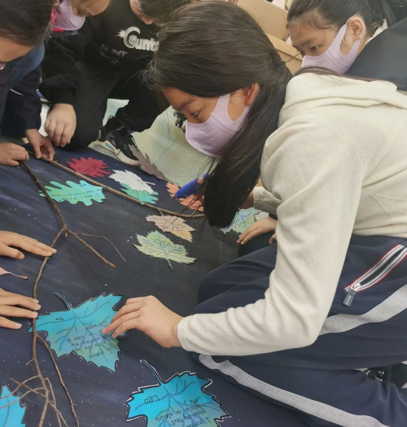 The students made a promise on the leaves for climate change: Starting with me, let us take away the earth’s pollution, let’s make our home green! Let's focus on climate action, let's work together to secure the future of people and the earth.