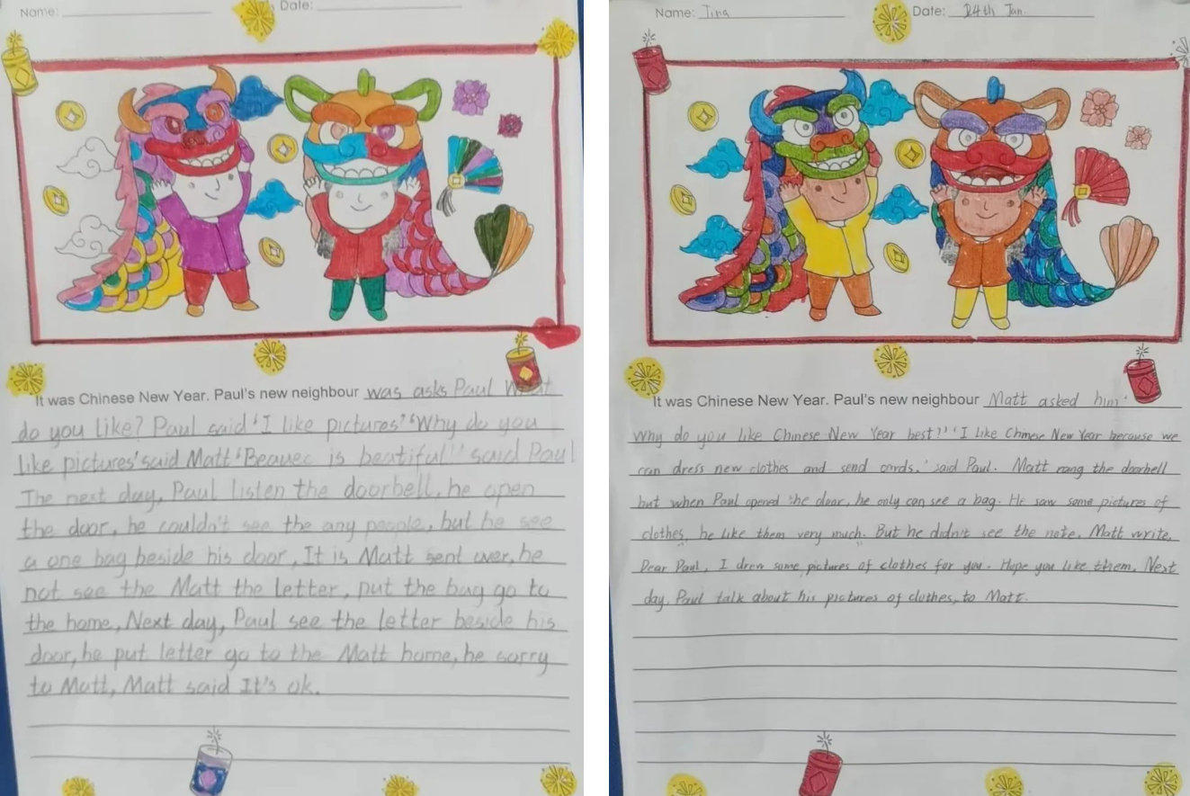 听、说、读、写是英语学习的四个要素。在寒假期间,同学们也牢抓语言的学习与积累,让我们来欣赏一下充满年味的英文写作吧!
