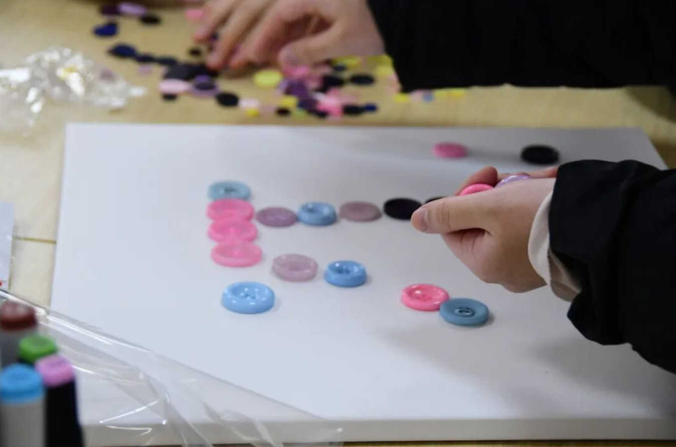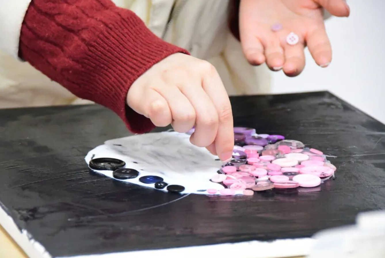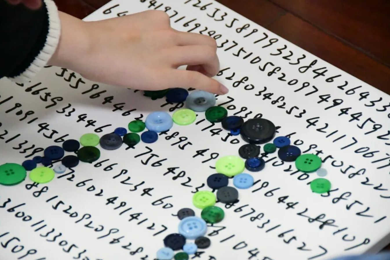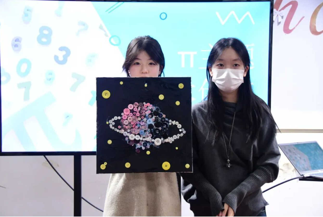 同学们结合数学与视觉艺术,利用刚刚寻宝得到的纽扣作为物资,制作出π主题的作品。大家不仅能体验到了π作为数学常数的魅力,还充分发挥了自己的艺术创意。