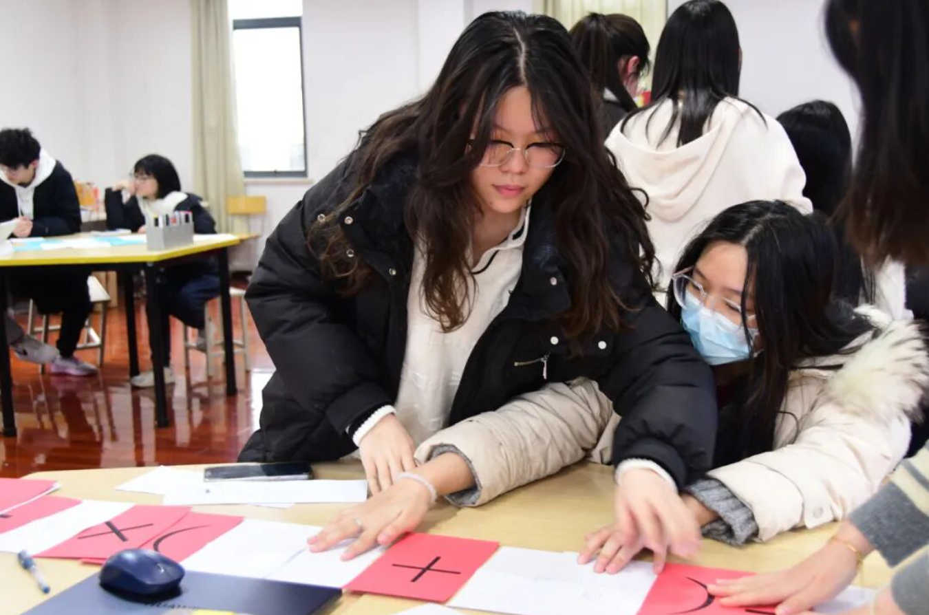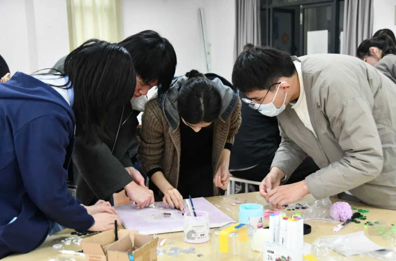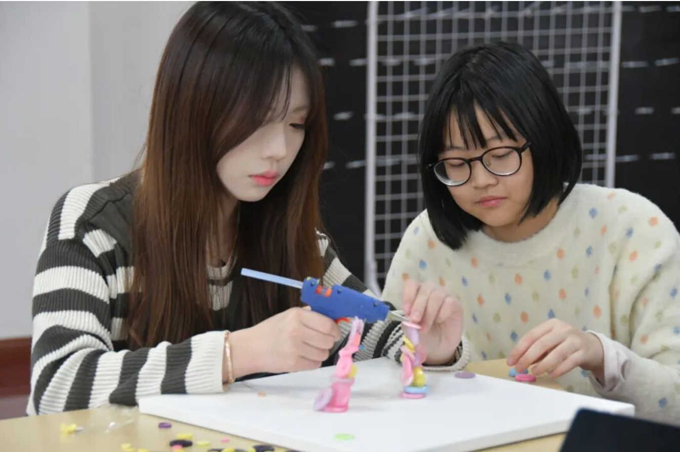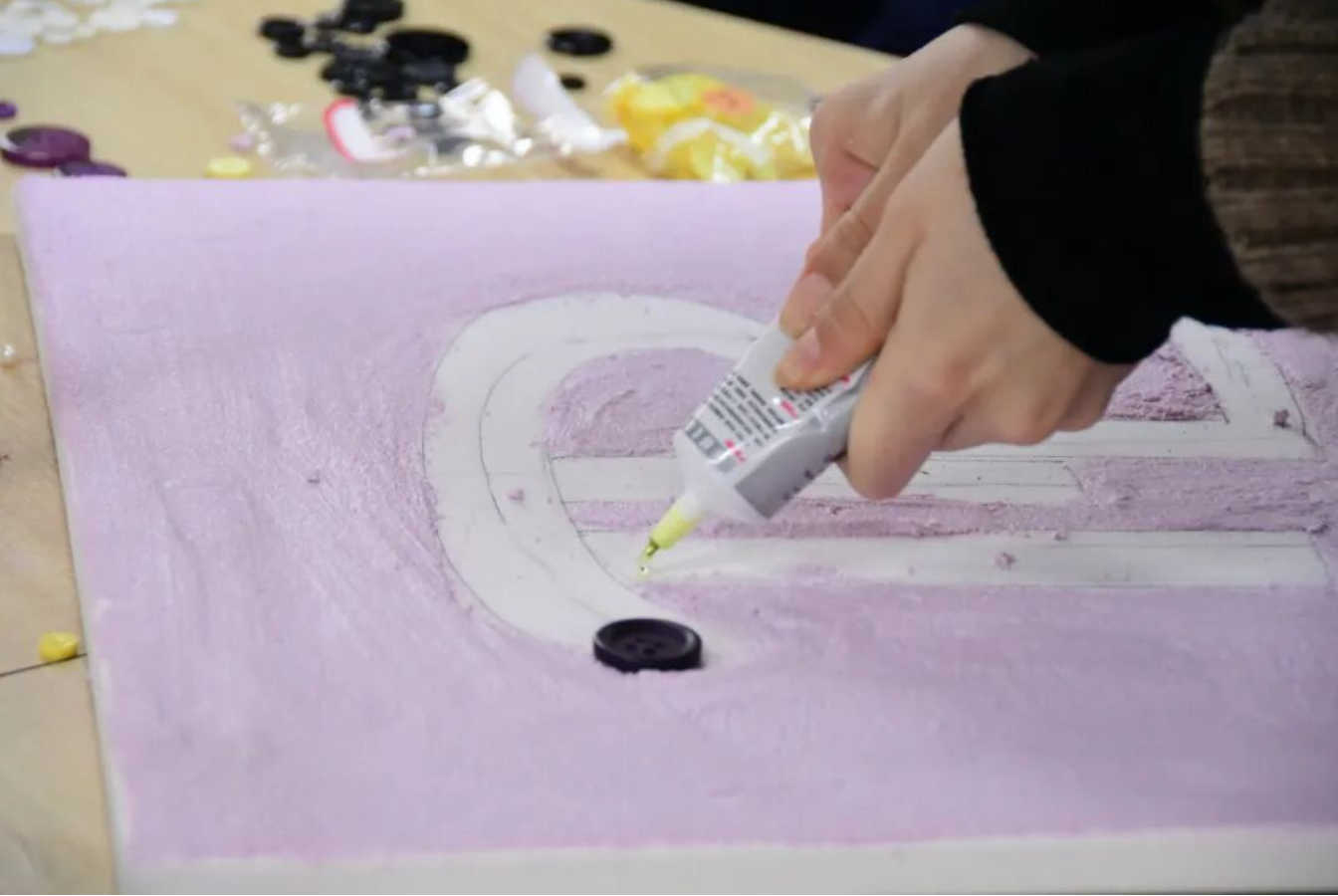 同学们结合数学与视觉艺术,利用刚刚寻宝得到的纽扣作为物资,制作出π主题的作品。大家不仅能体验到了π作为数学常数的魅力,还充分发挥了自己的艺术创意。