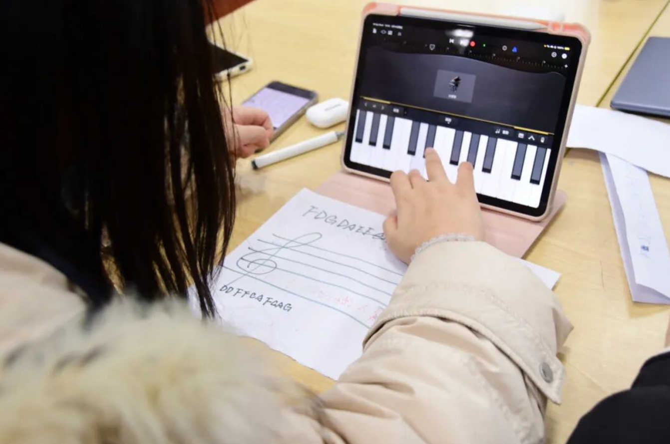 同学们从π的小数部分截取至少前10位数字,并将每个数字转化为对应的音符,音符使用C大调音阶进行分配。通过演奏乐器或使用音乐软件,大家创作出了属于自己的美妙旋律。在教室里,圆周率之歌悄悄响起。数学和音乐的结合,带来了别样的体验。
